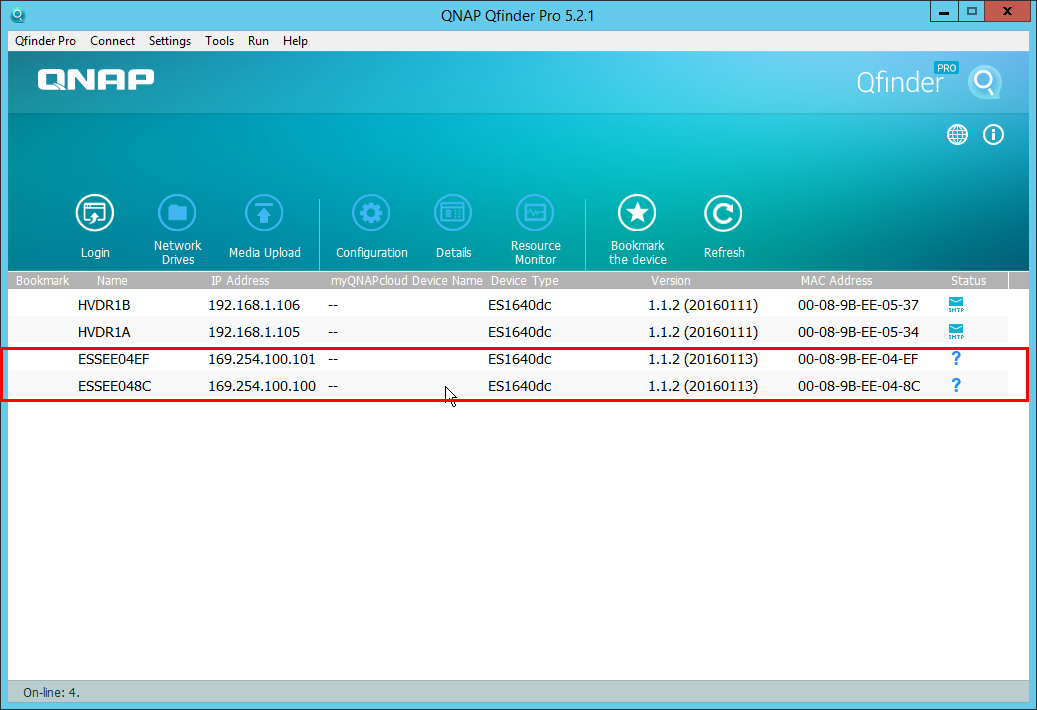 2. Locate IP address 169.254.100.100 in the Qfinder device list. This device the new ES NAS. The status shows “?”, meaning that the ES NAS hasn’t been configured before.
