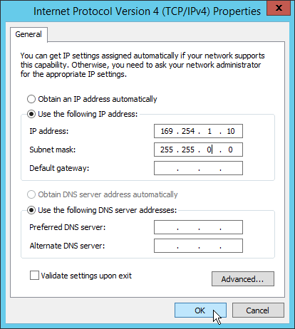 6. Enter the IP address “169.254.1.10”, and Subnet mask “255.255.0.0”. Click “OK”.