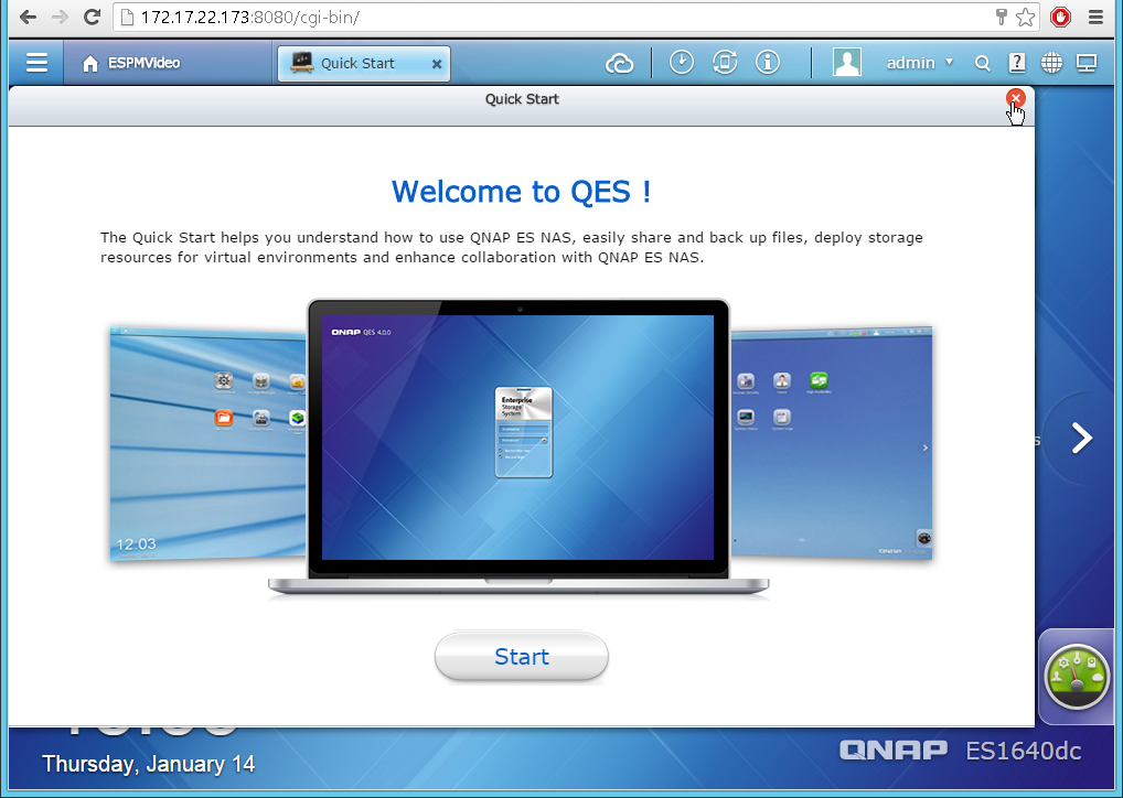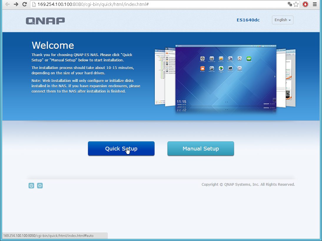 In an environment without DHCP, connect a PC directly to a NAS management port. Then open a web browser and enter the default QES IP: 169.254.100.100.