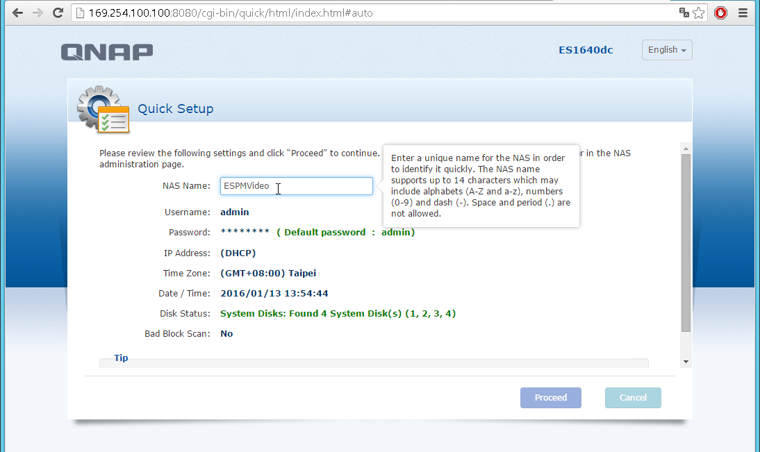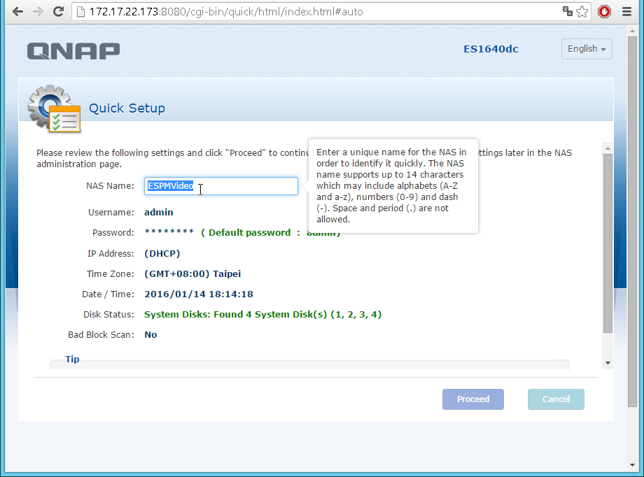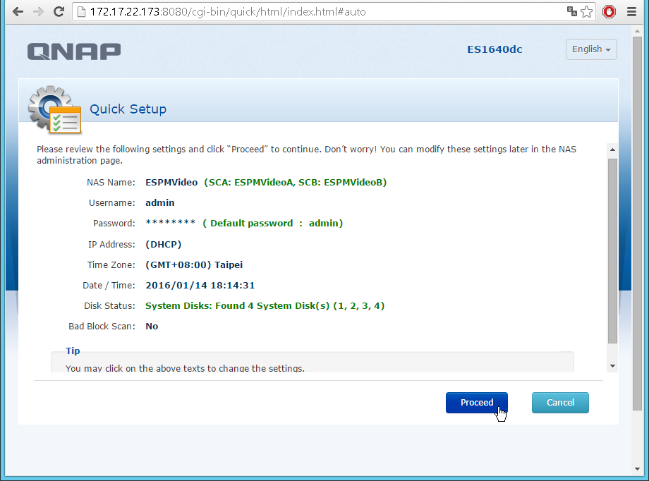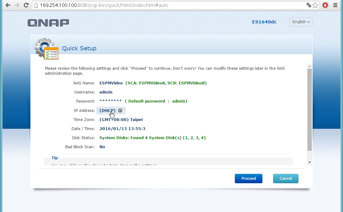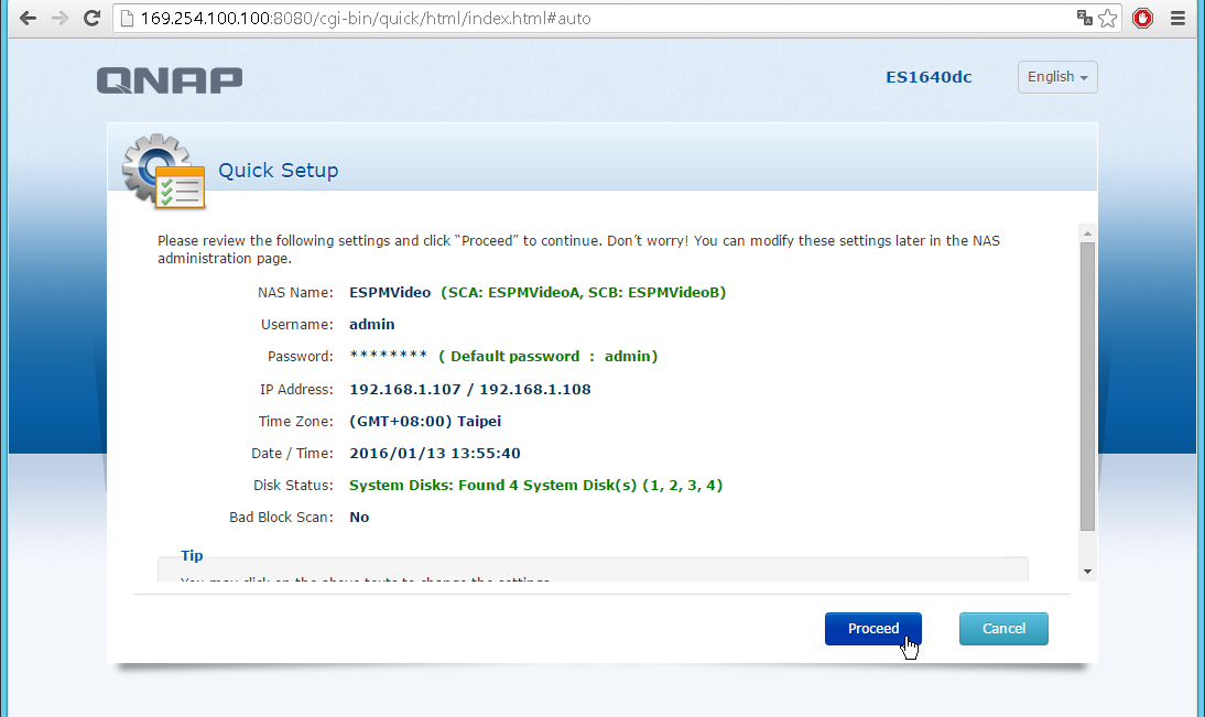 8. Specify a static IP Address for the NAS. In our example, we have two management ports connected and our LAN network is 192.168.x.x, so we use “192.168.1.107” and “192.168.1.108”. Click “Proceed”.