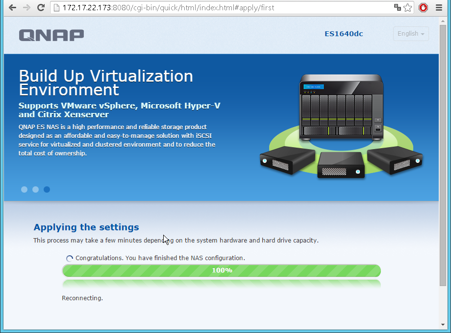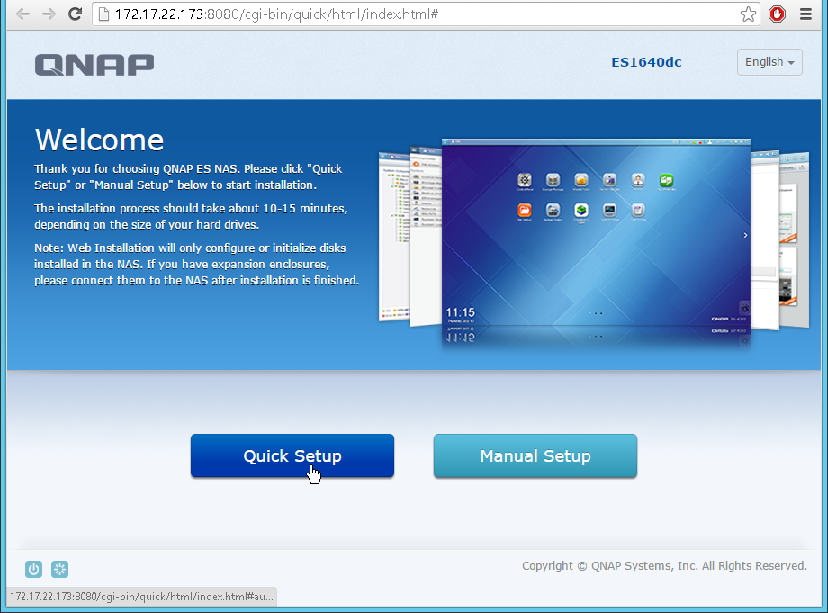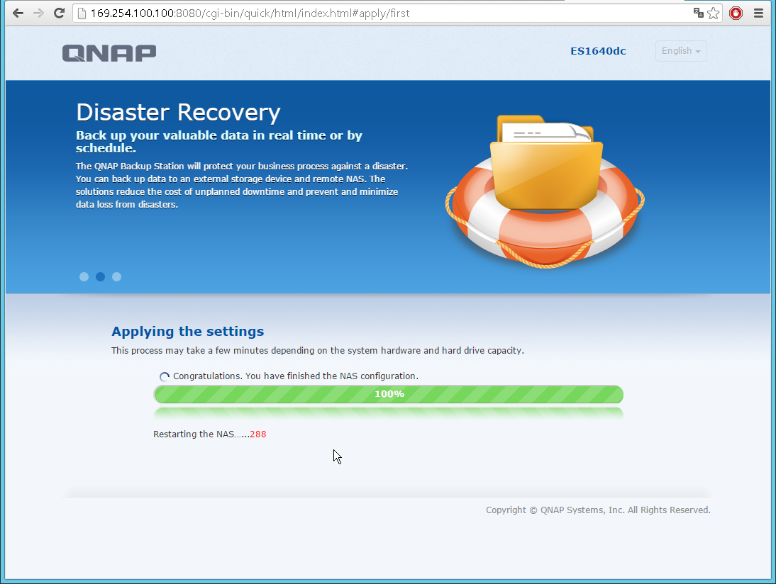 System start-up will take from 10 to 15 minutes, depending on the number of disks and the devices connected to the ES NAS.