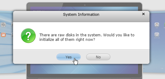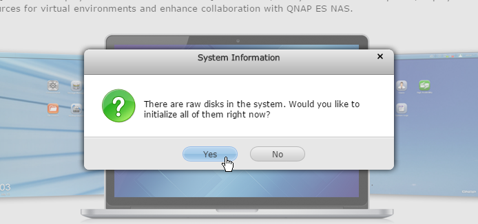 9. The system prompts you for confirmation of disk initialization, if any raw unused disks are found. Click “Yes” to begin disk initialization or “No” cancel.