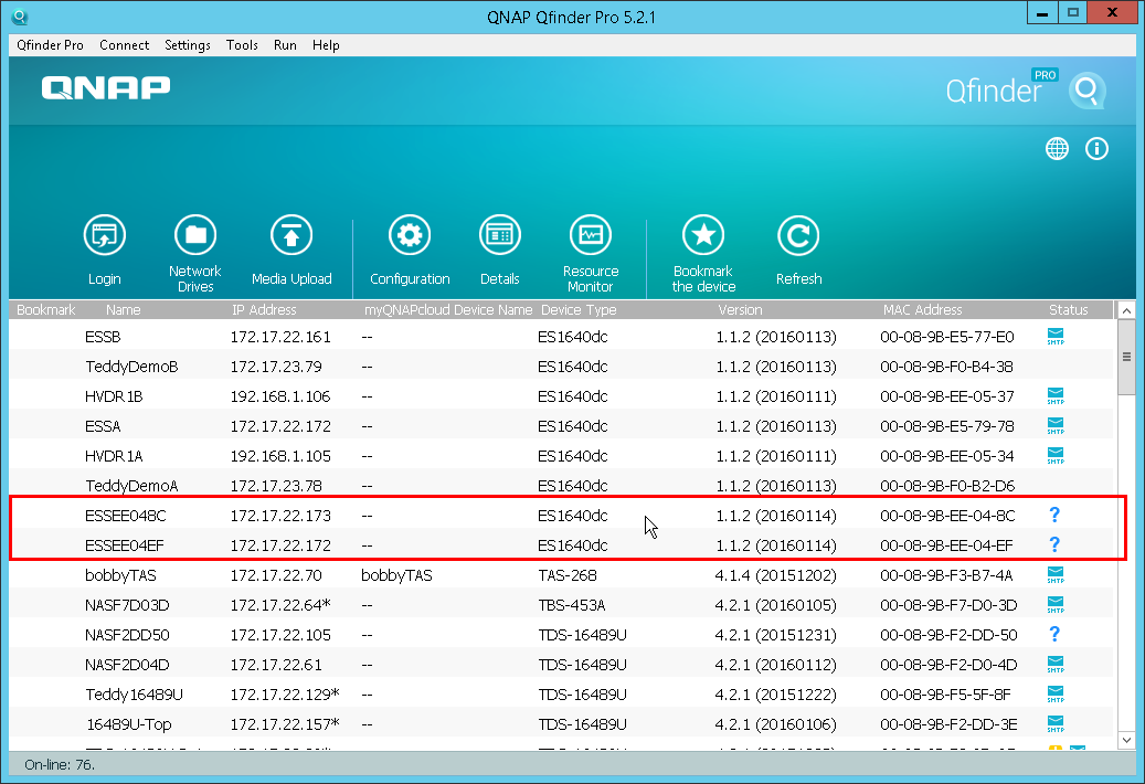 2. Locate the NAS with status “?”. This should be the new ES NAS. Confirm by checking the model under “Device Type”.