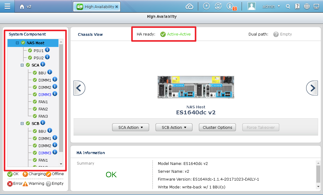 2. Before using the NAS, check if the System Components (displayed on the left) and the “HA ready” field (at the top) are all green. This indicates that the status is normal. Some of the components (for example, the PSU) may take longer (approximately 90 seconds) to confirm and show their status. If any components appear to be abnormal, check if the component is properly installed.