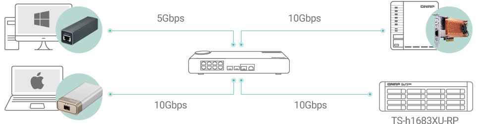 Zařízení TS-h1683XU-RP nabízí čtyři porty Gigabit RJ45 a také podporuje konektivitu 10GbE s předinstalovanou rozšiřující kartou 10GBASE-T se dvěma porty a SmartNIC 10GbE SFP+ se dvěma porty pro uspokojení aplikací náročných na šířku pásma, jako je virtualizace, sdílení velkých souborů a vysokorychlostní zálohování a obnova. Společnost QNAP také nabízí četné možnosti řízených a neřízených 10GbE switch s podporou 10GbE SFP+/RJ45 a Multi-Gigabit NBASE-T™, které pomáhají organizacím implementovat vysokorychlostní, zabezpečená a škálovatelná síťová prostředí bez překročení rozpočtu.