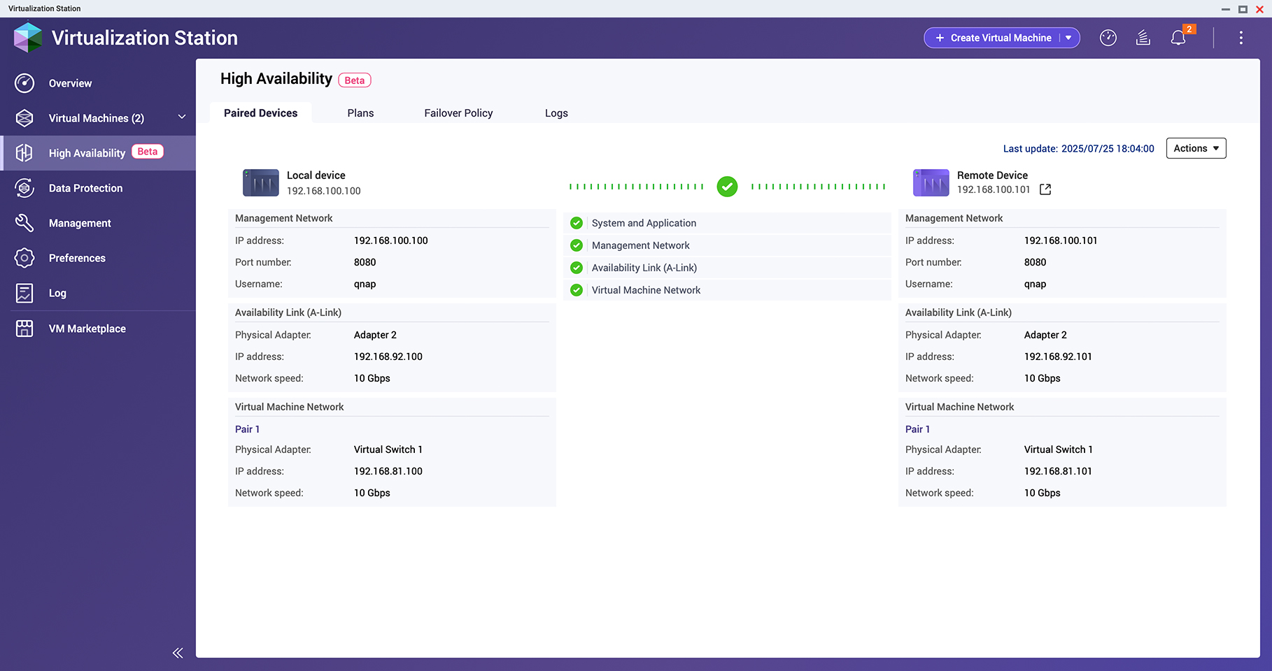 Nová funkce vysoké dostupnosti ve Virtualization Station v kombinaci s architekturou ZFS QuTS hero a synchronizací SnapSync v reálném čase umožňuje dvěma zařízením NAS vzájemně podporovat virtuální počítače. Podporuje více podmínek detekce poruch, obousměrnou ochranu a bezproblémové přepínání, čímž dosahuje skutečné vysoké dostupnosti virtualizace na podnikové úrovni.