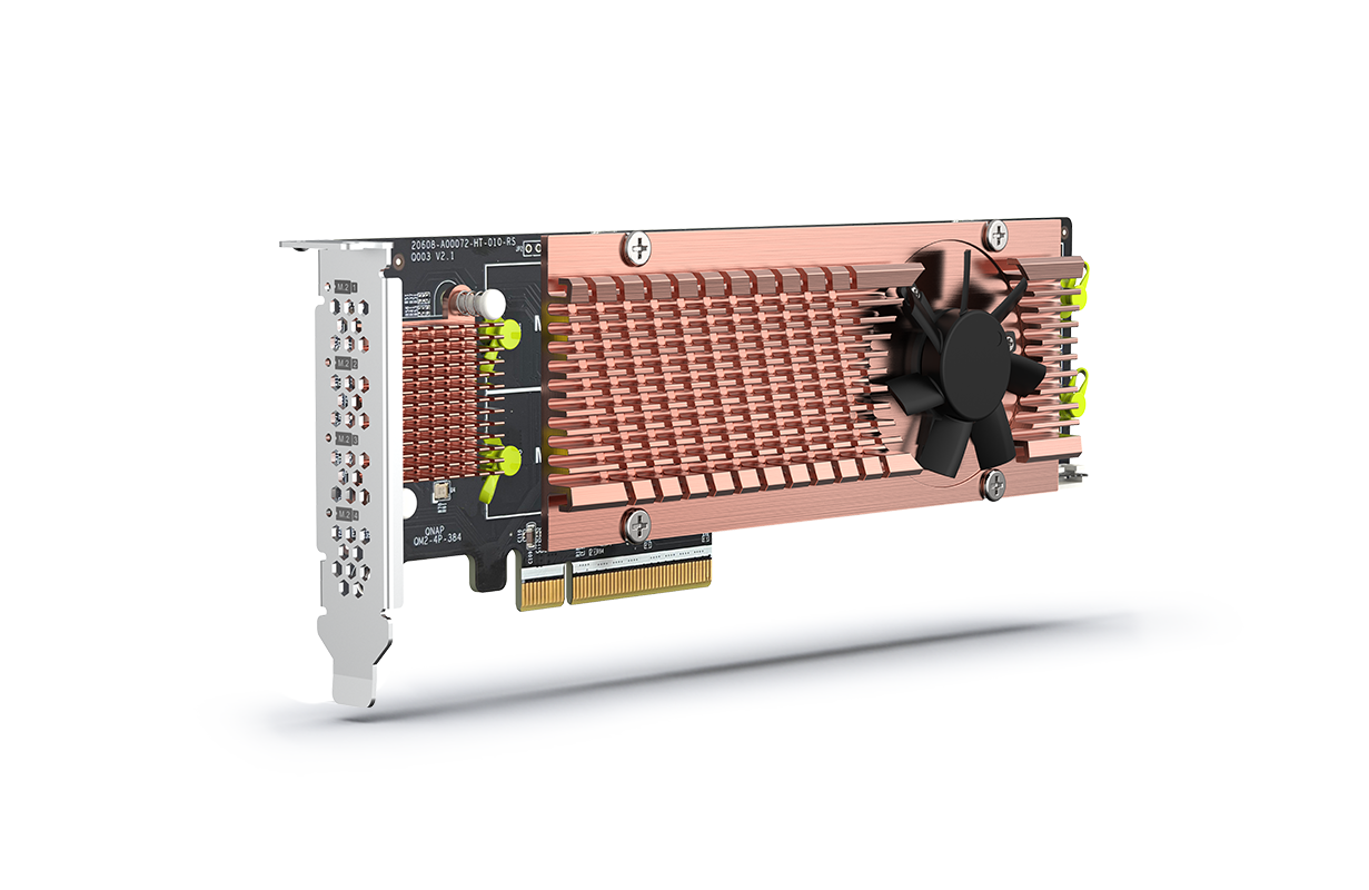 QM2 series PCIe cards add support for M.2 NVMe SSDs to a QNAP NAS, allowing users to configure SSD caching, a caching pool, or an auto-tiering volume to improve overall NAS performance.