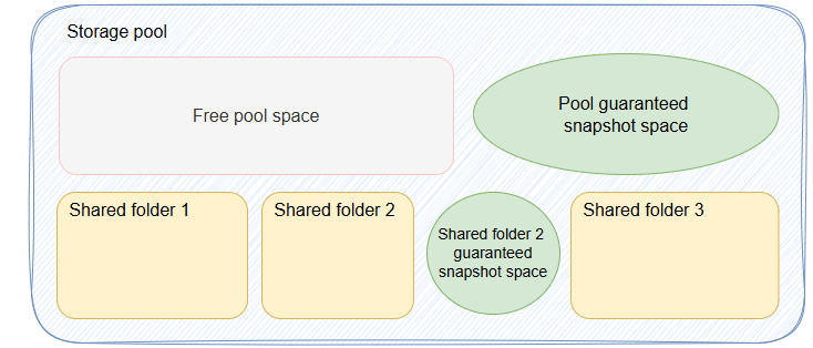 Nehmen wir als nächstes an, dass der garantierte Snapshot-Speicherplatz des Freigabeordners 2 und der garantierte Snapshot-Speicherplatz des Pools beide voll sind. Wenn wir mehr Snapshots von einem der Freigabeordner erstellen, wird freier Pool-Speicherplatz für die Speicherung der Snapshots verwendet.
