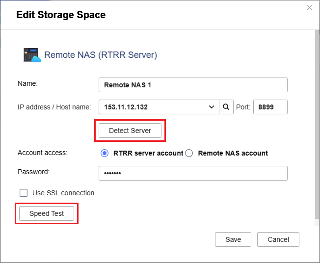 Das Fenster Speicherplatz bearbeiten wird geöffnet. - Klicken Sie auf Server erkennen, um zu überprüfen, ob das Remote-NAS über RTRR zugänglich ist.