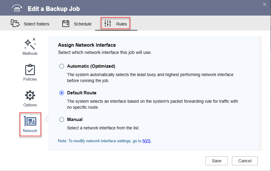 Das Fenster Einen Sicherungsauftrag bearbeiten wird geöffnet. - Wechseln Sie zu Regeln > Netzwerk.