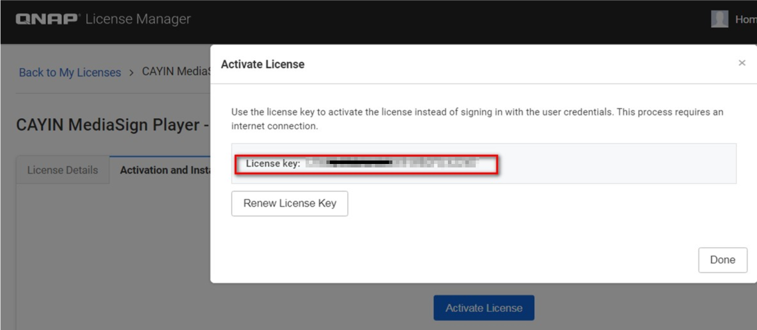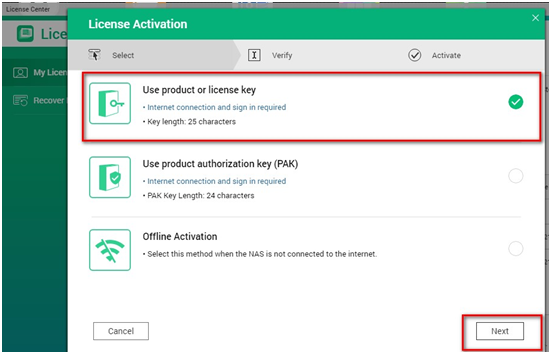 1. Find your license key from the License Manager web (https://license.qnap.com/) > License Name > Activation and Installation > Activate License > Activate using the license key > Next, copy the license key and paste it into the License Key Activation field of License Center app on the NAS.