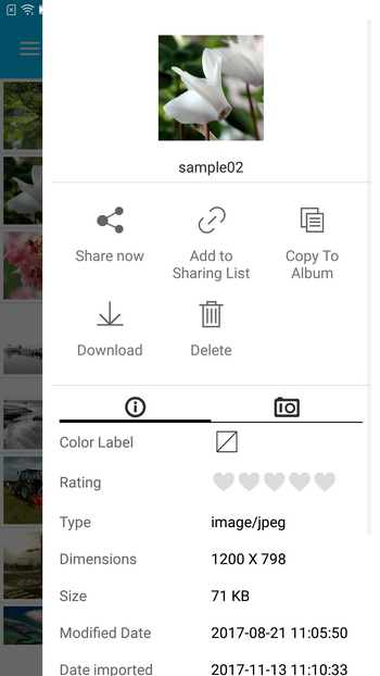 Liste: In diesem Modus werden die detaillierten Informationen zu Ihren Fotos angezeigt (Farbmarkierung, Bewertung usw.). Tippen Sie für weitere Optionen auf . Sie können Dateien freigeben, kopieren, herunterladen oder löschen. Sie können sich auch die Informationen von Fotos ansehen.