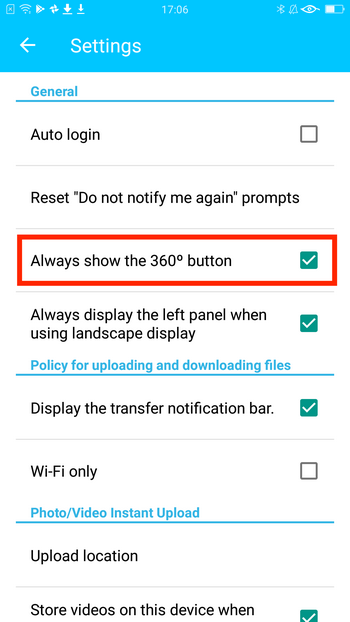 Standardmäßig wird die 360° Panorama Schaltfläche immer im Multimedia Viewer angezeigt. Rufen Sie zum Ändern dieser Einstellung "Einstellungen" > "Allgemein" auf.
