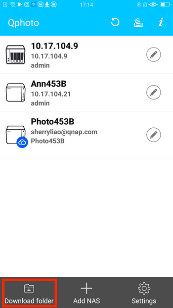 Qphoto merkt sich die erste erfolgreiche Verbindung und stellt sie als Standardmethode ein. Um die standardmäßige Verbindungsmethode zu ändern, tippen Sie auf das NAS-Symbol und halten Sie es gedrückt, um eine Verbindungsmethode auszuwählen.