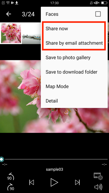 Um Fotos über E-Mails oder soziale Netzwerke freizugeben, tippen Sie auf den Multimedia Viewer und wählen Sie "Jetzt freigeben" oder "Per E-Mail Anhang freigeben". Beachten Sie, dass Sie die erforderlichen Anwendungen von Drittanbietern installieren müssen, um Dateien über soziale Netzwerke wie Facebook freigeben zu können.