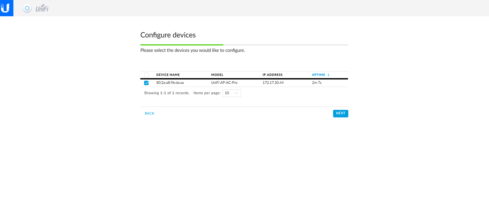 - Wählen Sie die Geräte aus, die Sie mit Ihrem UniFi Controller Container konfigurieren und verwenden möchten.