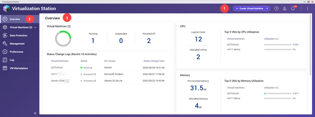 Mit Virtualization Station können Sie VMs erstellen, VM-Dateien importieren und virtuelle Appliances (VAs) über den VM Marketplace bereitstellen.