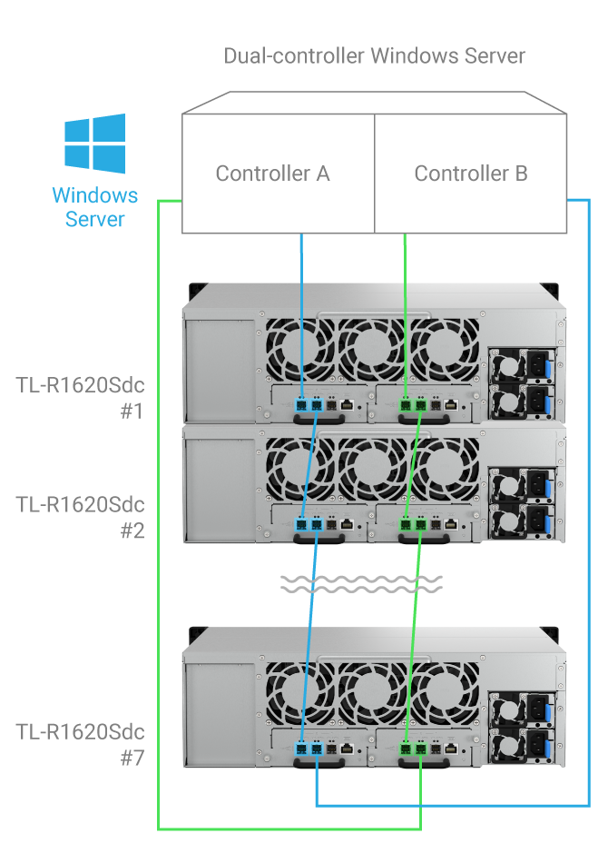 Schließen Sie das TL-R1620Sdc an einen Dual-Controller Windows®-Server an und erstellen Sie eine redundante Cross Loop-Konfiguration, die Erweiterungseinheiten mit redundanten Pfaden zum Host-Server und Schutz zwischen JBOD-Verbindungen bietet. Falls ein oder mehrere Pfade zum TL-R1620Sdc unterbrochen werden, können andere Erweiterungseinheiten weiterhin mit dem Host-Server kommunizieren. Dies ist für die maschinenübergreifende Datensicherung und Kapazitätsskalierbarkeit für unterbrechungsfreie geschäftskritische Unternehmensaufgaben unerlässlich.