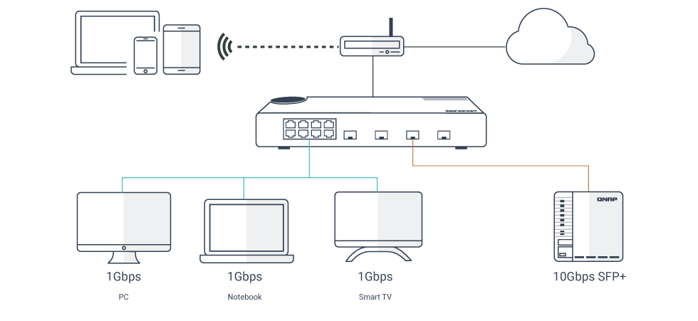 From NAS with built-in 10GbE SFP+ and 10GBASE-T ports, or NAS with PCIe slots that support 10GbE/5GbE/2.5GbE network adapters, QNAP has led the industry in 10GbE adoption. Other high-speed network solutions from QNAP include Thunderbolt 3 to 10GbE Network Adapters and USB 3.2 Gen 1 to 5GbE Network Adapters. These can all be used with the QSW-M408S to create a comprehensive high-speed network environment for boosting the performance of photo/video editing, virtualization, large-file data transfers, and other bandwidth-demanding tasks.