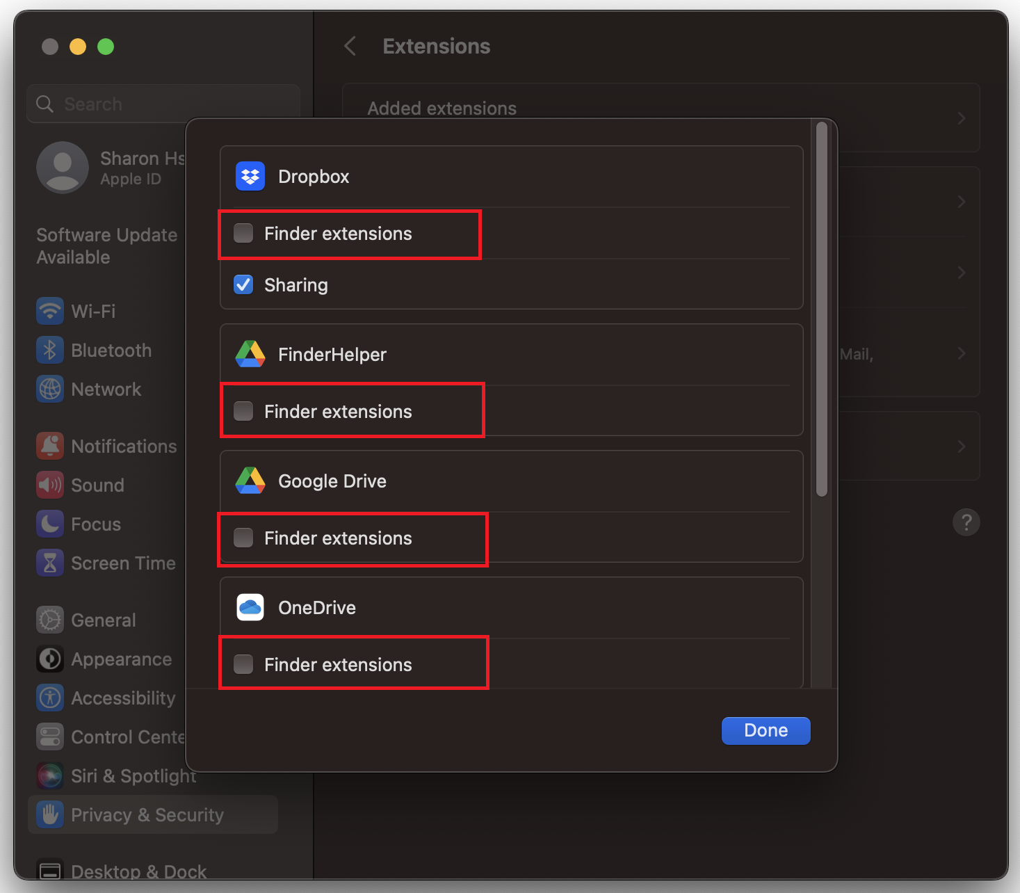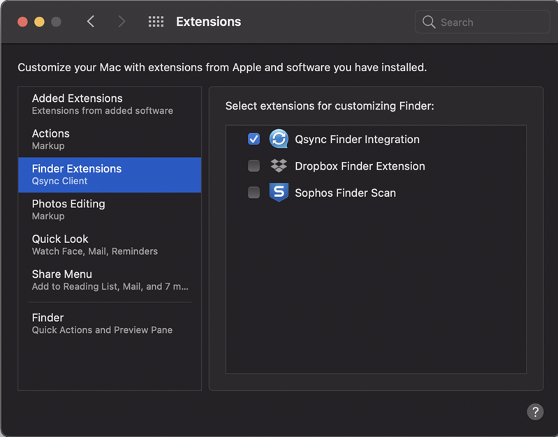 To ensure that Qsync status icons are displayed in macOS Finder, perform the following steps: