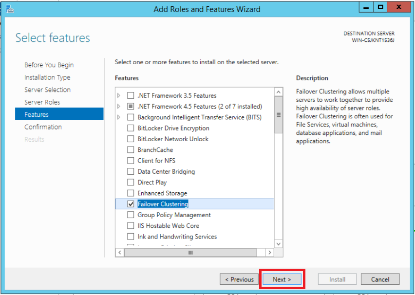 For being a node of cluster, the server should first have the Failover Clustering feature installed. Click “Add roles and features” then click Next.