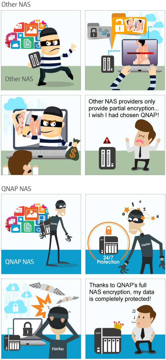 For business users, QNAP provides a unified storage solution with both security and functionality. Even if the Turbo NAS is encrypted, all the files can still be accessible via Windows SMB/CIFS, iSCSI, and NFS protocols. In contrast, some NAS brands only allow users to encrypt newly created shared folders, and thus they will not be able to access these shared folders via NFS protocol, resulting in great inconvenience. With full NAS encryption, QNAP offers Turbo NAS users 100% security and a convenient private cloud storage solution.
