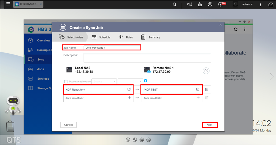 Important: File corruption may occur if you create two (or more) one-way sync jobs with the same remote shared folder as the destination folder. - Click Next.