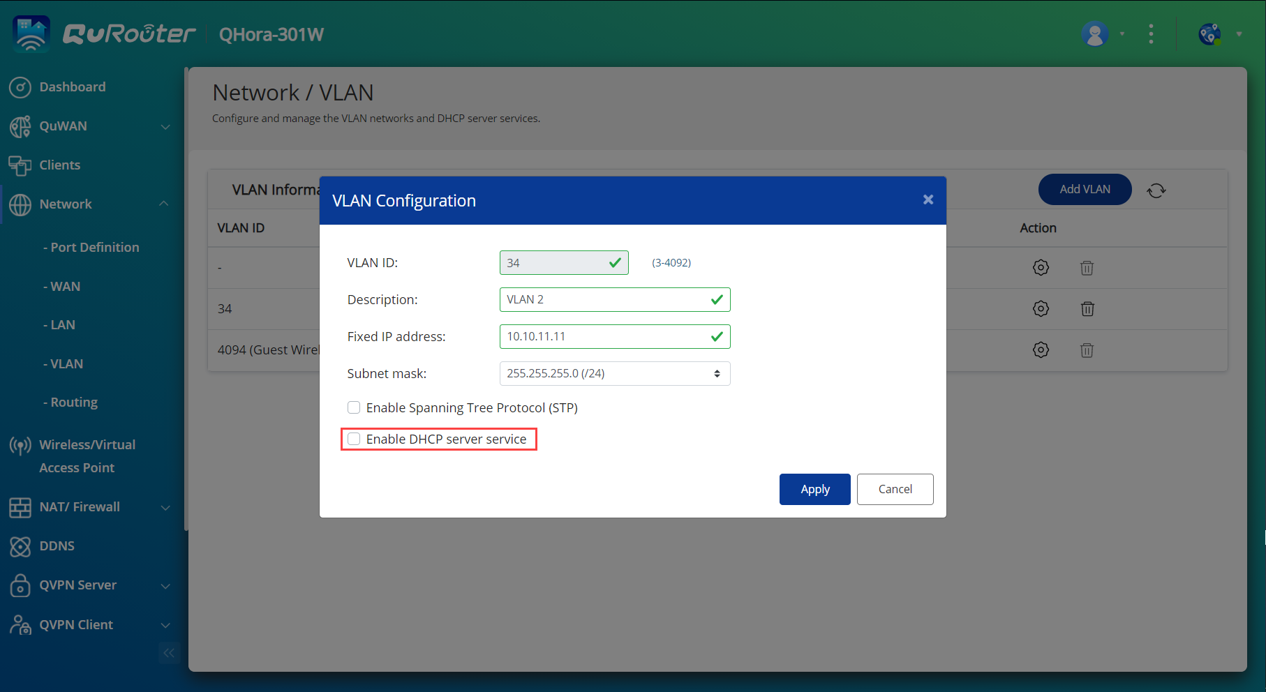 to edit an existing VLAN. Click Add VLAN to create a new VLAN. - Specify the following: