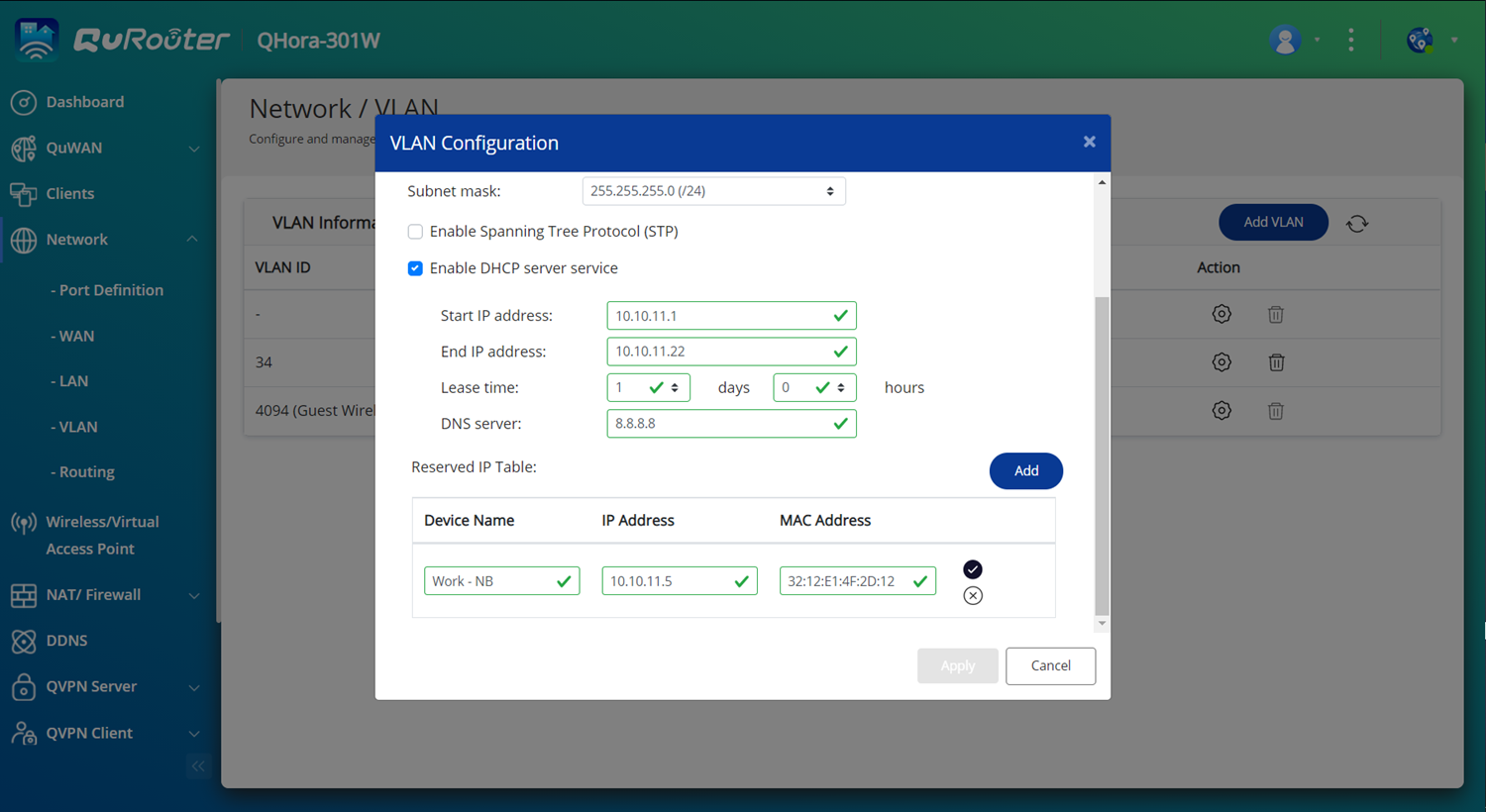 Use the Network > VLAN page to reserve IP addresses for specific devices by adding their media access control (MAC) address to the DHCP reserved IP table.