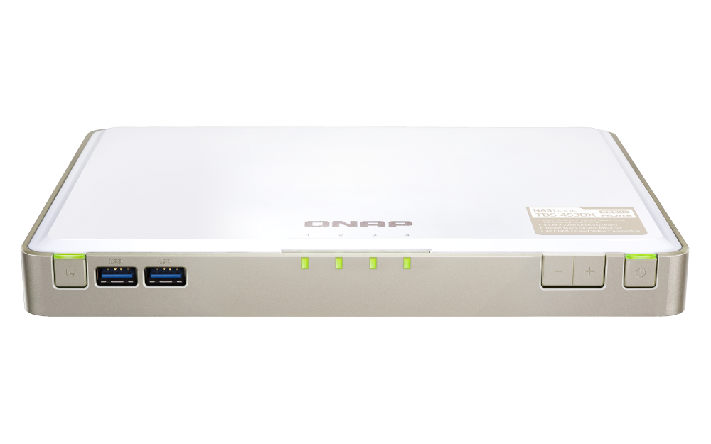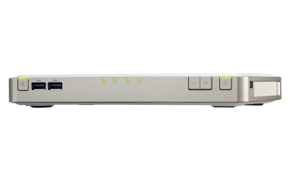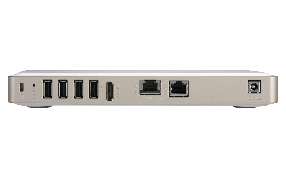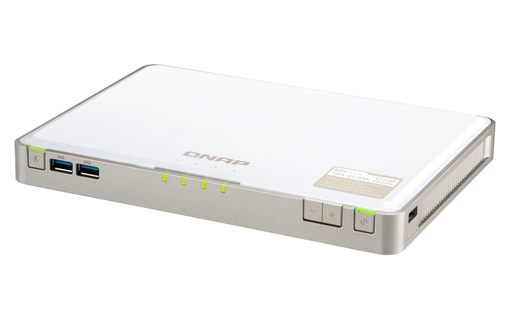 For the SSD compatibility list, please visit https://www.qnap.com/compatibility/SSD Cache Acceleration Support Gigabit Ethernet Port (RJ45) 1 10 Gigabit Ethernet Port 1 x 10GBASE-T (10G/5G/2.5G/1G/100M) Wake on LAN (WOL) Jumbo Frame USB 2.0 port 4 USB 3.2 Gen 1 port 3 IR Sensor (RM-IR004) HDMI™ Output 1, HDMI™ 2.0 (up to resolution 3840 x 2160 @ 60Hz) Audio Input - (No longer available on units manufactured on or after 2021/1/1) Audio Output - (The line out jack and speaker are no longer available on units manufactured on or after 2021/1/1) Form Factor Set-top design LED Indicators SSD1-4 Buttons Power, Reset, Copy, Audio volume Dimensions (HxWxD) 30 × 230 × 165 mm Weight (Net) 0.8 kg Weight (Gross) 1.7 kg Operating Temperature 0 - 40 °C (32°F - 104°F) Storage Temperature -20 - 70°C (-4°F - 158°F) Relative Humidity 5-95% RH non-condensing, wet bulb: 27˚C (80.6˚F) Power Supply Unit External Power Adapter, 65W, 100-240V Power Consumption: Disk Standby Mode 12.38 W Power Consumption: Operating Mode, Typical 16.52 W Tested with drives fully populated.Fan 1 x system fan System Warning Buzzer Kensington Security Slot Standard Warranty 2 Max. Number of Concurrent Connections (CIFS) - with Max. Memory 1500 Note: Use only QNAP memory modules to maintain system performance and stability. For NAS devices with more than one memory slot, use QNAP modules with identical specifications and refer to the hardware user manual to install compatible QNAP memory modules.