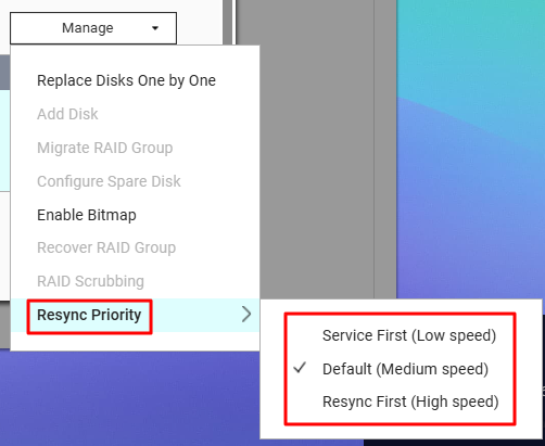 - You can adjust Resync Priority (Service First, Default, Resync First) to control sync speed versus system responsiveness.