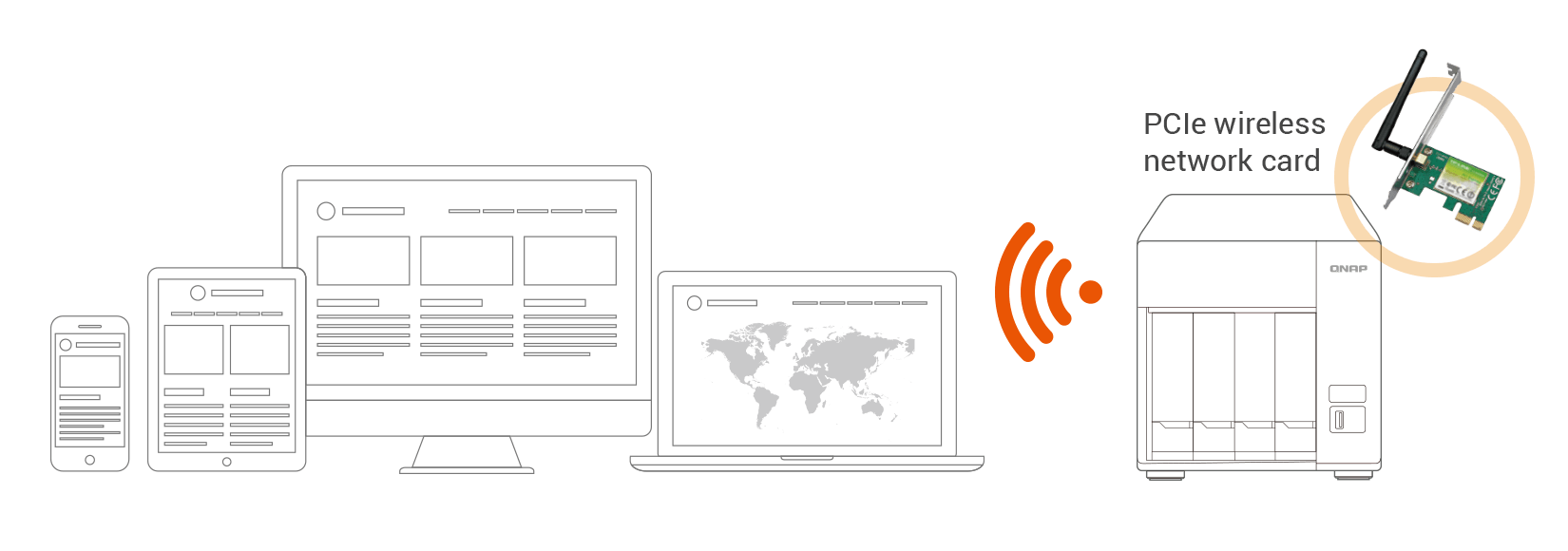 Install a compatible PCIe wireless network card (for example: QNAP QWA-AC2600) on the TS-473 and use with the WirelessAP Station app to use your NAS as a convenient wireless base station. Your mobile devices and PCs can directly connect to your NAS for easy access to its services and Internet connection.