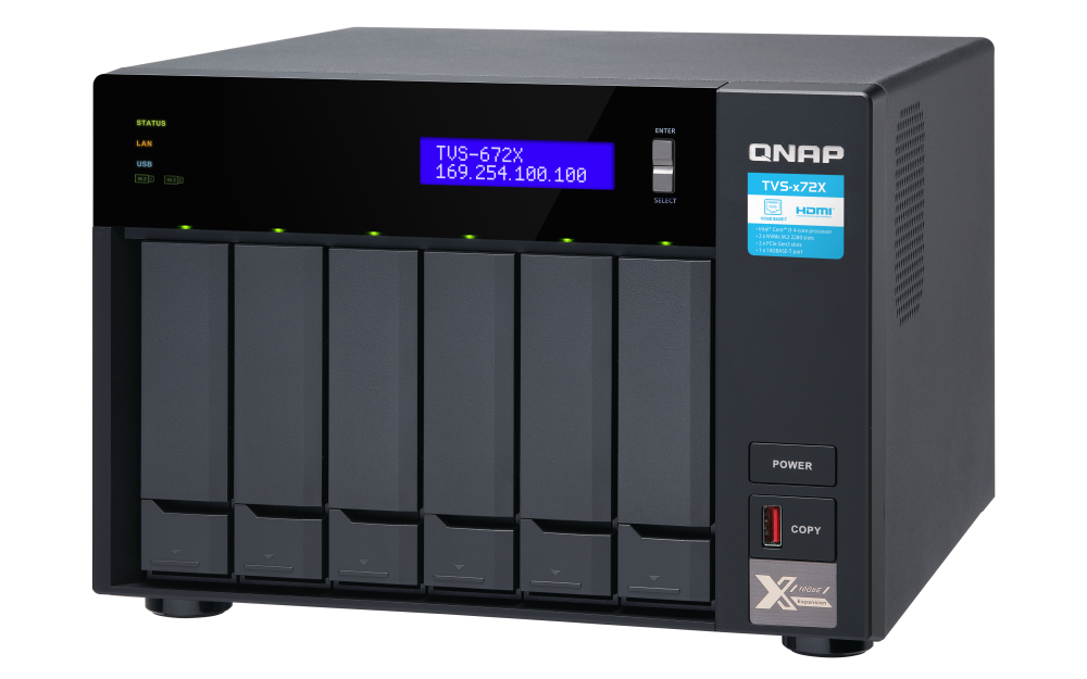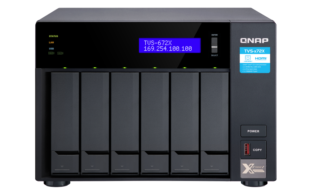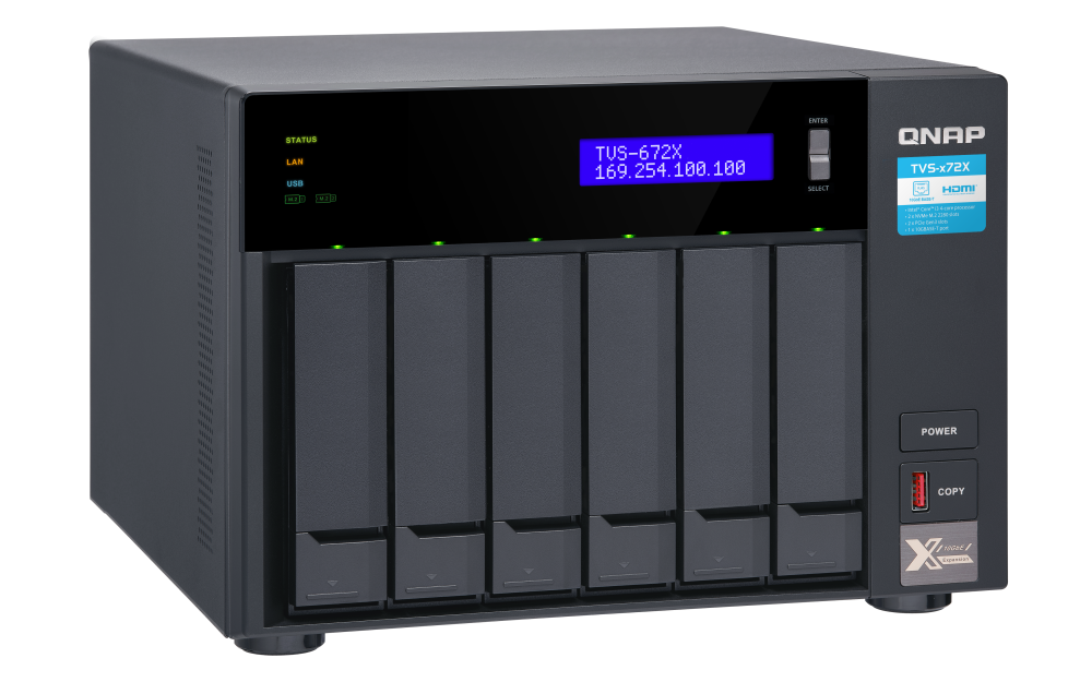 2.5-inch SATA solid state drivesHot-swappable (Not supported M.2 SSD) M.2 Slot 2 x M.2 2280 PCIe Gen3 x2 slots Compatible with NVMe SSD PCIe Gen 3 and above. Please refer to https://www.qnap.com/compatibility/ for compatibility.SSD Cache Acceleration Support GPU pass-through Gigabit Ethernet Port (RJ45) 2 10 Gigabit Ethernet Port 1 x 10GBASE-T (10G/5G/2.5G/1G/100M) Wake on LAN (WOL) Jumbo Frame PCIe Slot 2