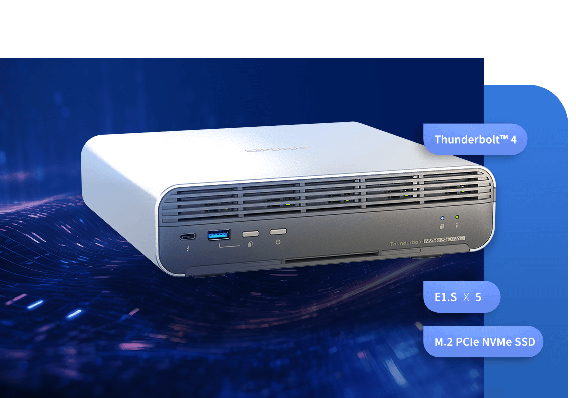 Install five E1.S or M.2 PCIe NVMe SSDs to efficiently transfer 4K video and large files.