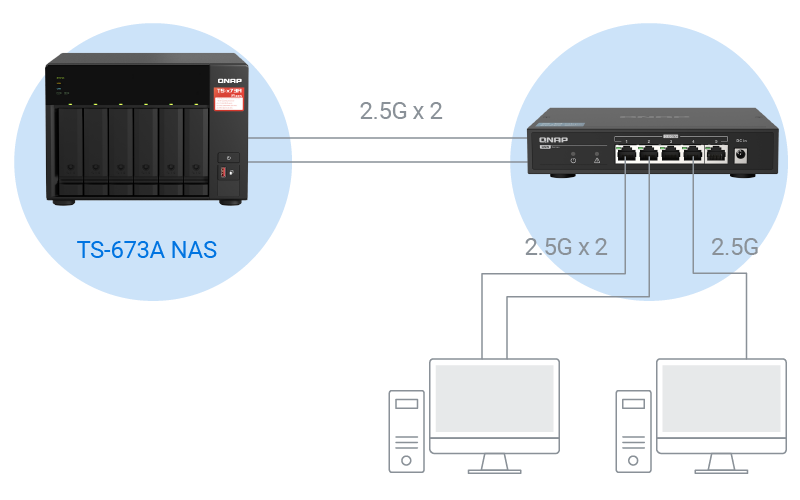 Enable SMB Multichannel on TS-673A NAS to combine two 2.5GbE ports for up to 5Gbps transmission speed. This increased bandwidth greatly accelerates large file transfer/backup and video editing applications.