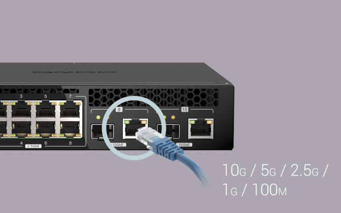 Includes two 10GbE SFP+/ RJ45 combo ports. Compatible with 10GbE and NBASE-T technologies to support five speeds (10G / 5G / 2.5G / 1G / 100M) using existing cables.