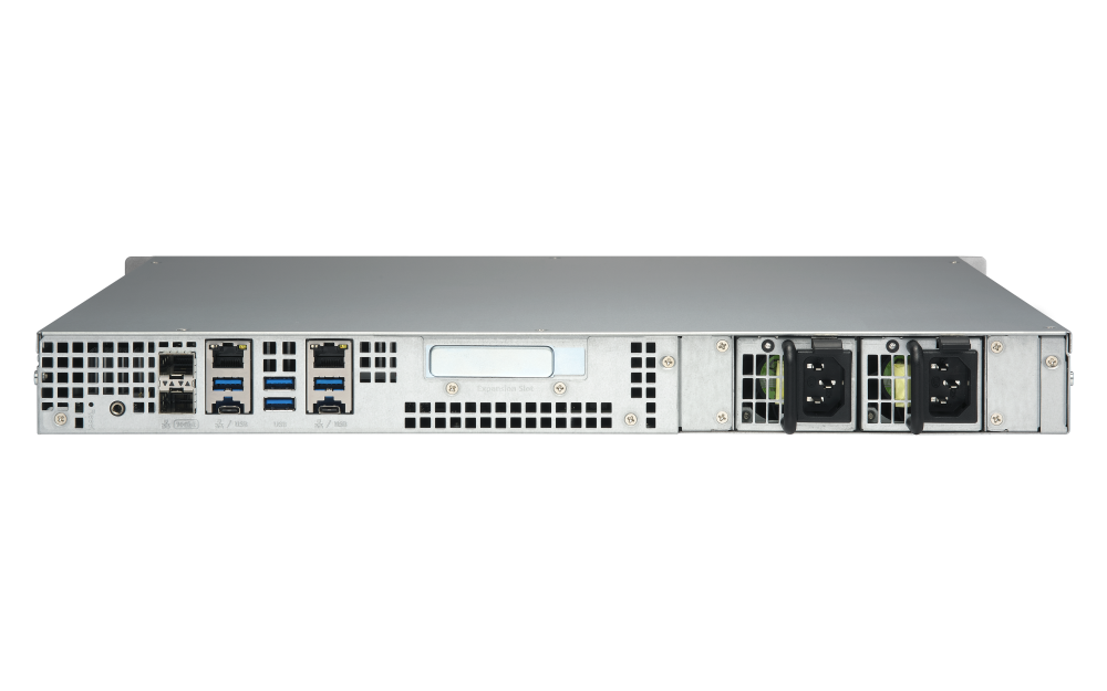 Slot 1: PCIe Gen 3 x16Card dimensions for PCIe slot:215 x 68.9x 18.76 mm / 8.46 x 2.71 x 0.74 inchesUSB 3.2 Gen 1 port 4 USB 3.2 Gen 2 (10Gbps) Port 2 x Type-C USB 3.2 Gen 2 10Gbps Form Factor 1U Rackmount LED Indicators HDD 1-4, SSD 1-5, Status, LAN Buttons Power, Reset Dimensions (HxWxD) 43.3 × 482.6 × 507.54 mm Excludes ear hook and the protruding part of the Power Supply Unit.Weight (Net) 8.63 kg Operating Temperature 0 - 40 °C (32°F - 104°F) Storage Temperature -20 - 70°C (-4°F - 158°F) Relative Humidity 5-95% RH non-condensing, wet bulb: 27˚C (80.6˚F) Power Supply Unit 300W(x2), 100-240V Power Consumption: Operating Mode, Typical 84.74 W Tested with drives fully populated.Fan System fan: 3 x 40mm, 12VDC System Warning Buzzer Standard Warranty 3 Max. Number of Concurrent Connections (CIFS) - with Max. Memory 10000 Note: Use only QNAP memory modules to maintain system performance and stability. For NAS devices with more than one memory slot, use QNAP modules with identical specifications and refer to the hardware user manual to install compatible QNAP memory modules.