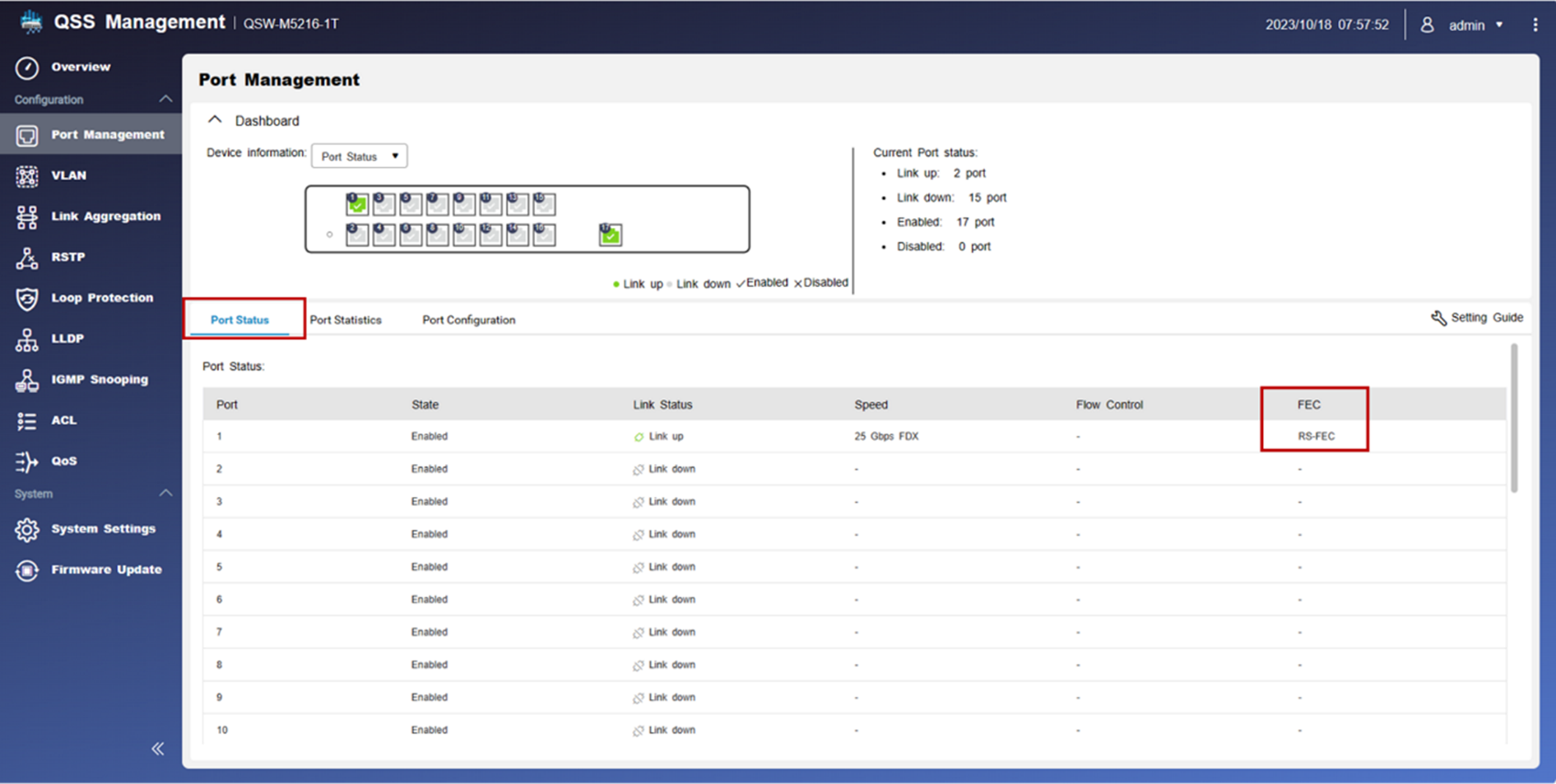 TipTo view the current FEC mode applied to the interfaces, go to Port Management > Port Status. - Click Save.