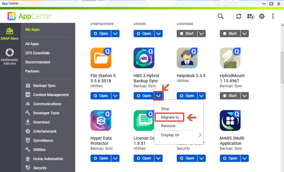 QPKG apps refer to QNAP’s packaged applications, which you can install from App Center on your QNAP NAS. To better manage storage, QNAP provides a Migrate to function in App Center, allowing you to move supported QPKG apps and their data from one storage volume to another within the same NAS. Not all QPKG apps support this migration function or the ability to choose a target volume during installation.