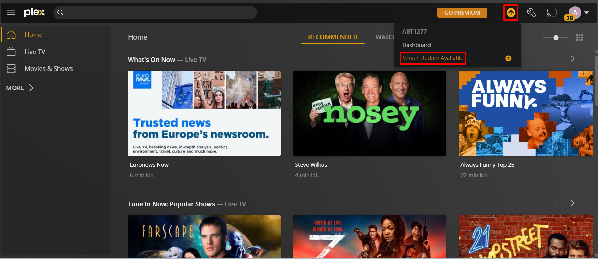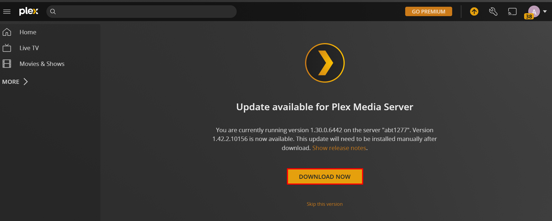 - In the Plex Media Server web interface, click the Activity icon at the top right of the app and click on Server Update Available if a new update package is available.