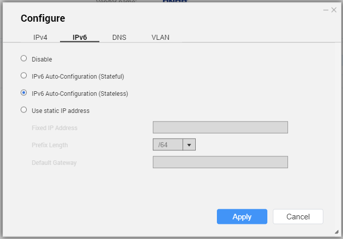 IPv6 Auto-Configuration (Stateless) | The adapter automatically acquires an IPv6 address and DNS settings from the router. Important:This option requires an available IPv6 RA(router advertisement)-enabled router on the network. |