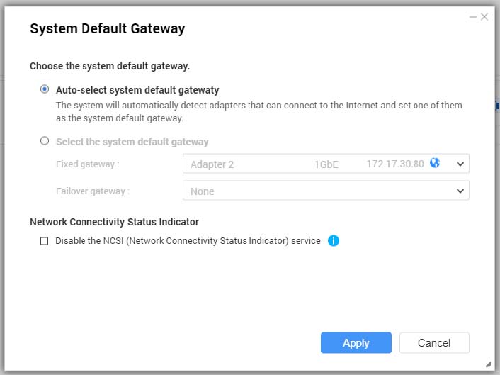 Auto-select system default gateway | QTS automatically detects all adapter, virtual switch, PPPoE, and VPN connections that can be used to connect to the internet. It selects one of these connections and then sets it as the default gateway. |