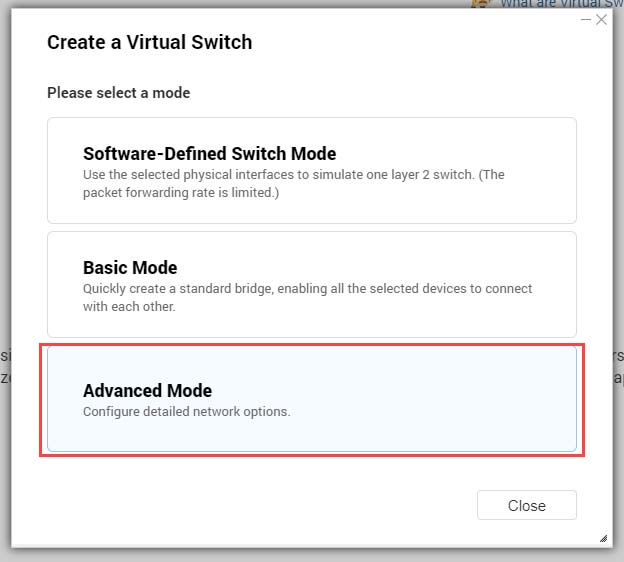 Network & Virtual Switch features two separate usage modes. Switch between these modes by clicking Basic or Advanced in the Network & Virtual Switch menu pane.