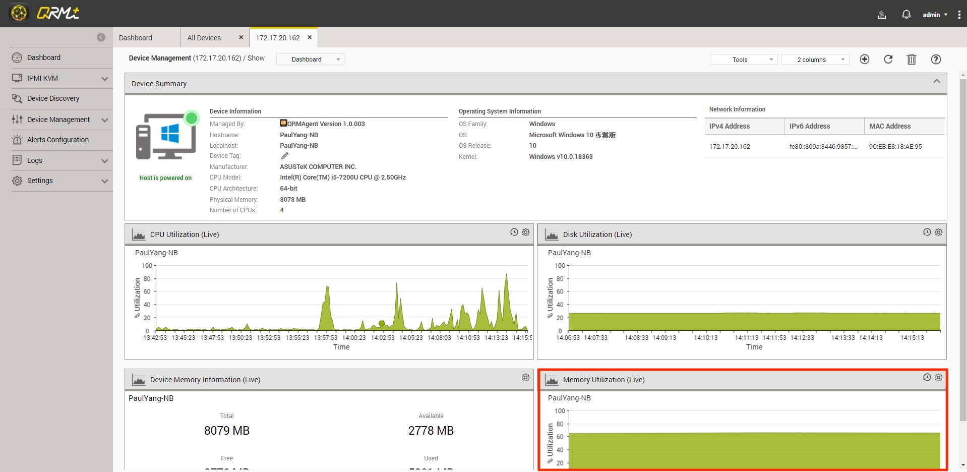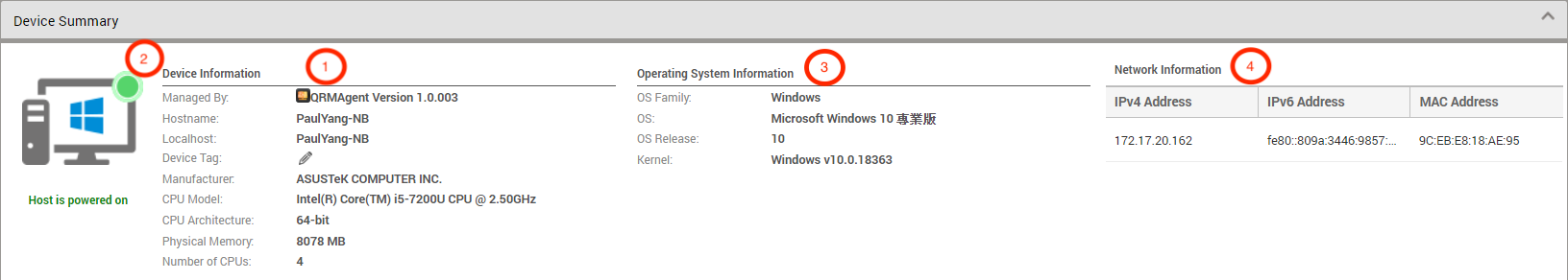 QRMAgent Single Device Dashboard provides detailed information about a specific managed device, including: