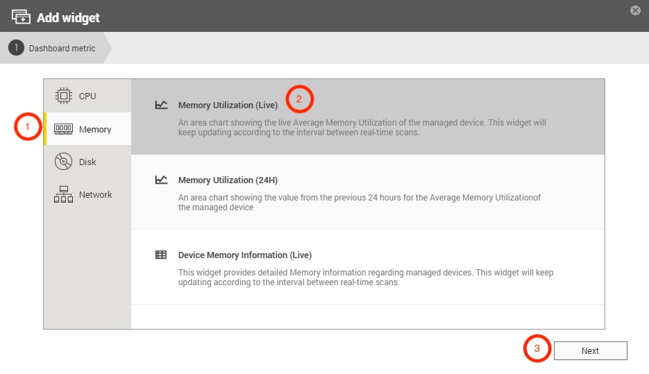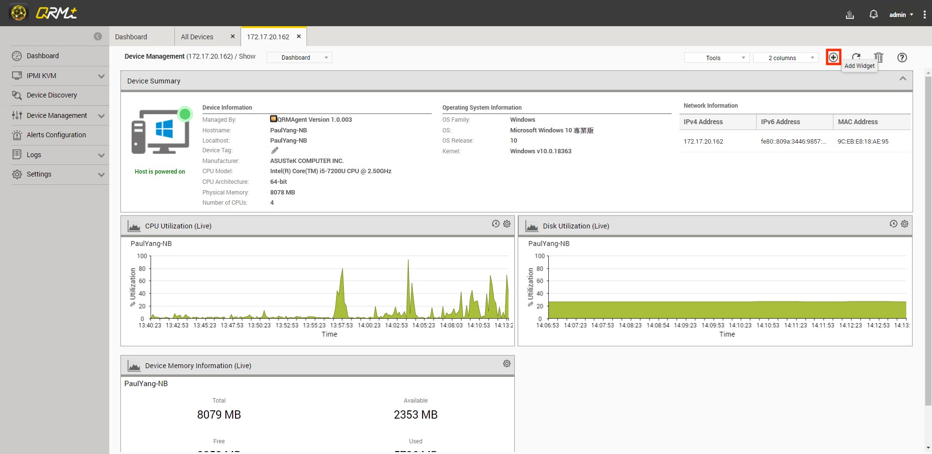 Step 1: Go to QRMAgent Single Device Dashboard page and click the "Add Widget" button