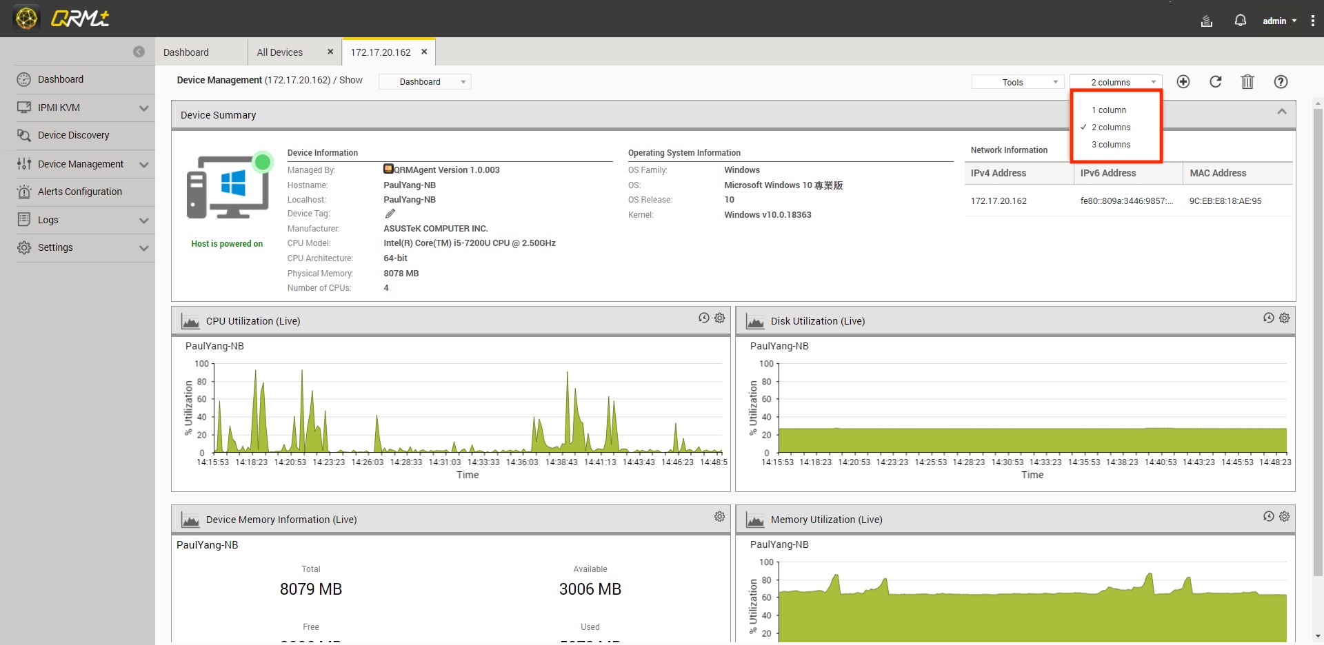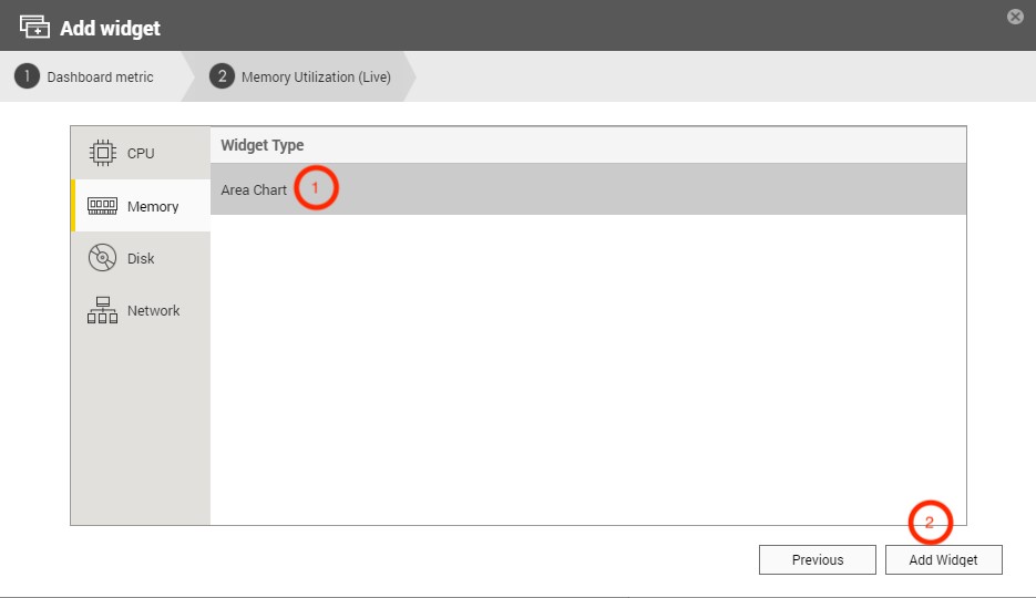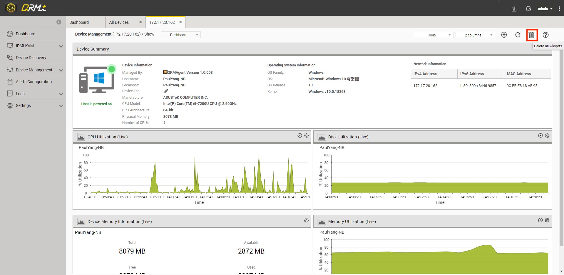 Users can add multiple widgets to customize QRMAgent Single Device Dashboard to monitor CPU usage, memory usage, disk usage, network usage and more, there are also multiple chart types at the user's disposition.