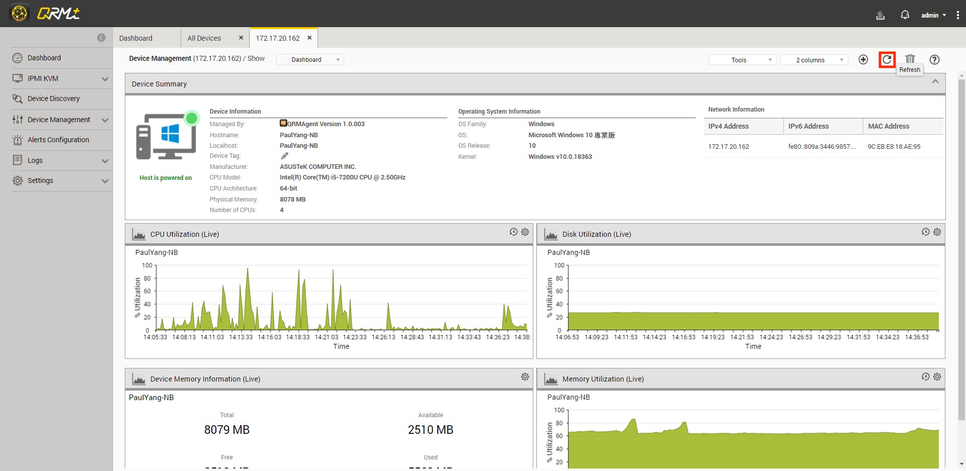 Go to the Single Device Dashboard page and click the "Refresh" button