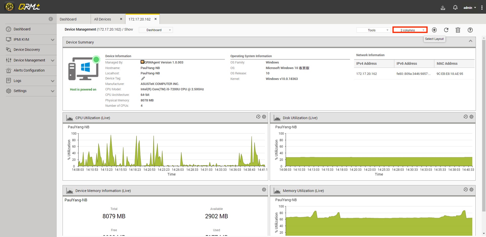 Step 1: Go to QRMAgent Single Device Dashboard page and Click the "Select Layout" button