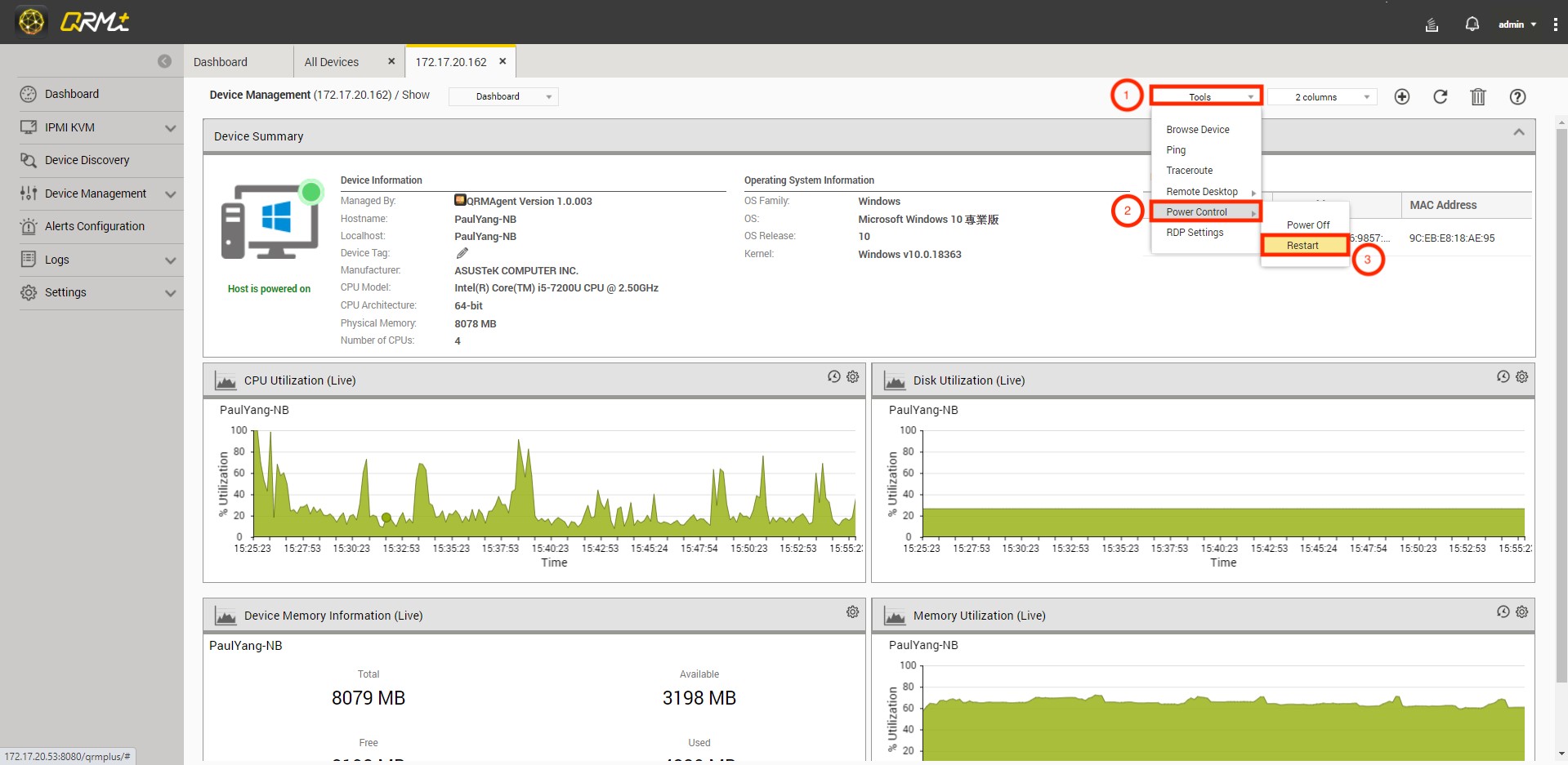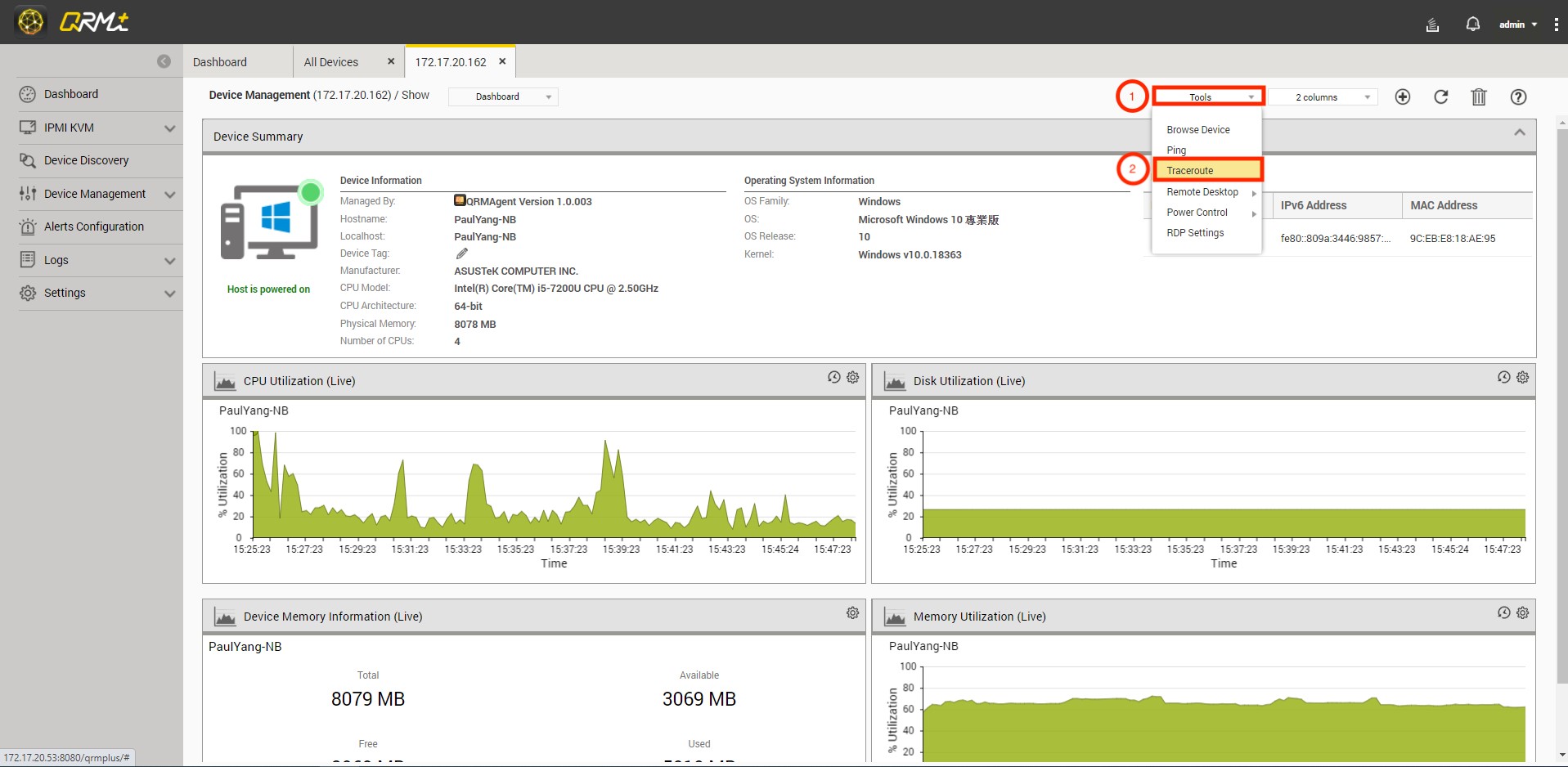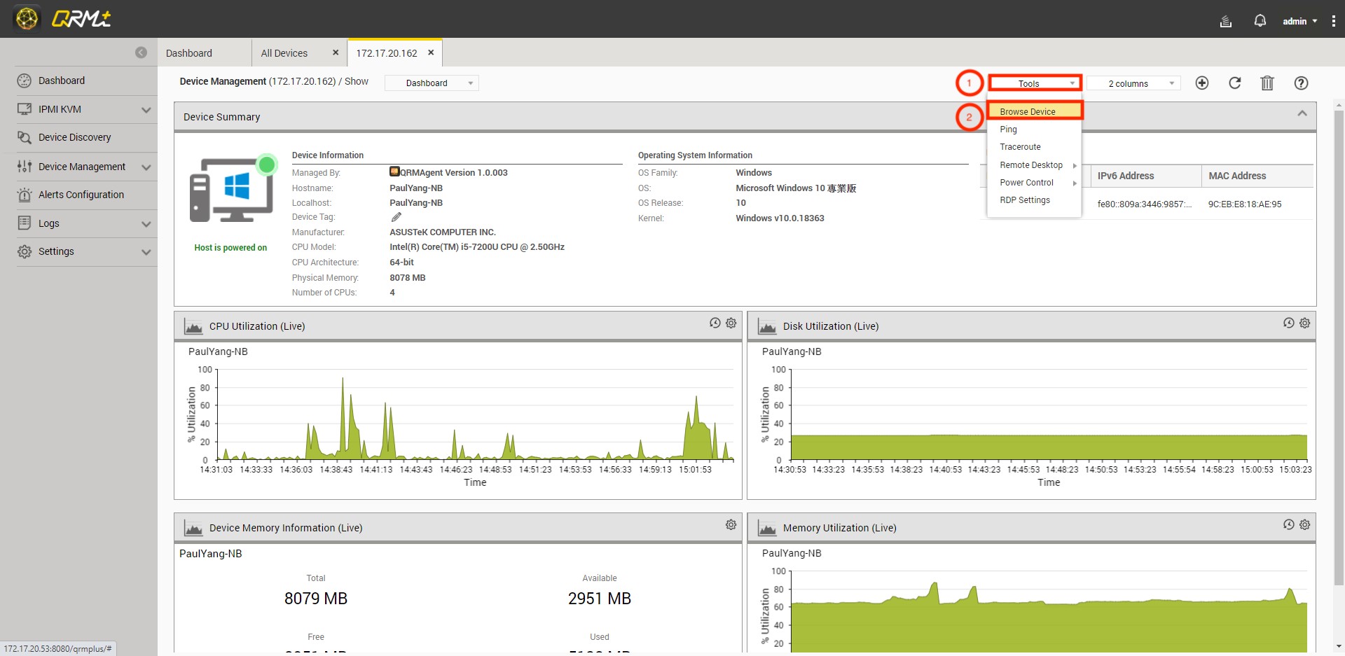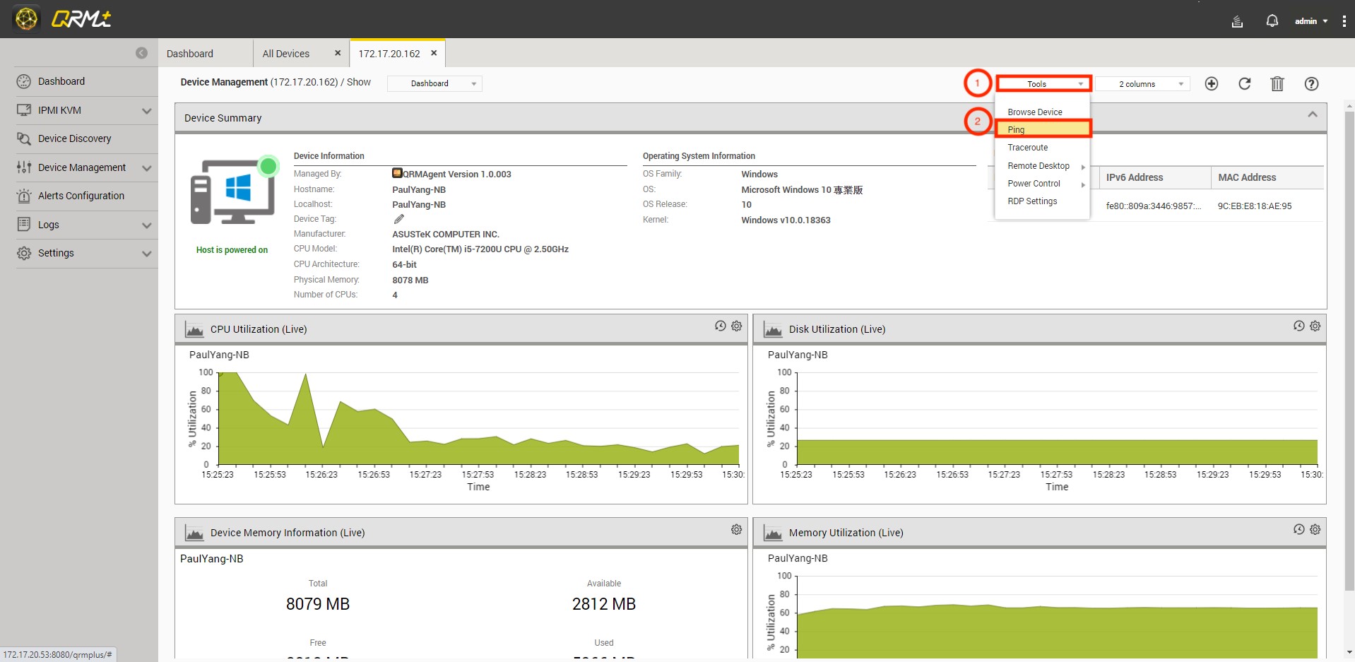 Step 1: Go to QRMAgent Single Device Dashboard page and click the "Tools" button