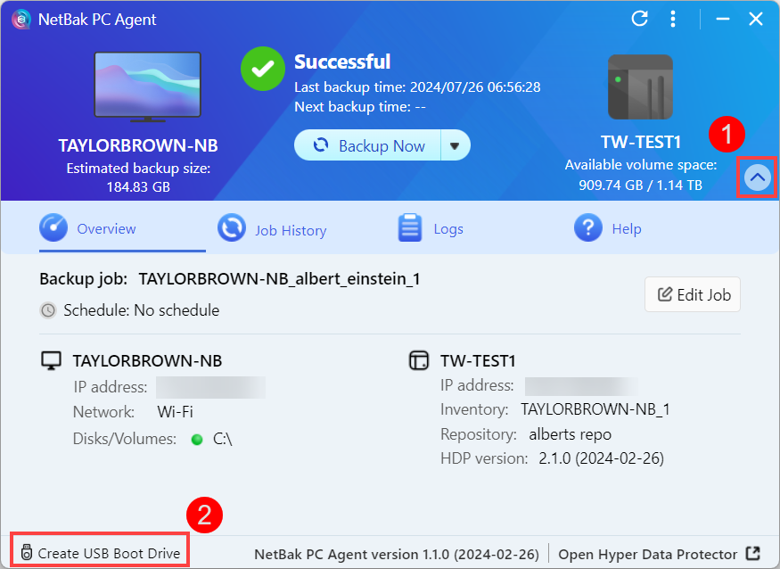 For details on creating backup jobs, see the section "Back Up Your Windows PC or Server" in How do I back up and restore my Windows PC or server with NetBak PC Agent?TipBackup jobs for your devices can be managed in HDP. - After creating the backup job, run the backup job by clicking Backup now.WarningWhile your PC/server is being backed up: